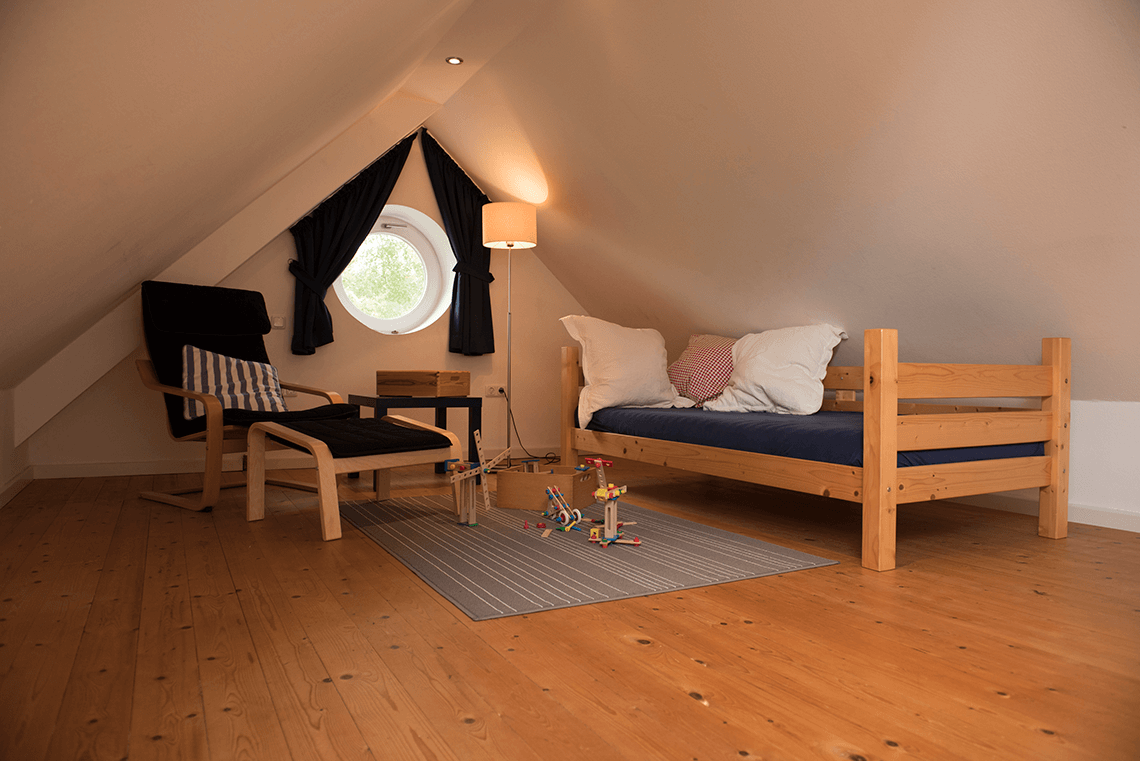 Zwei Schlafzimmer, ein weiteres Badezimmer sowie ein zusätzlicher Raum im Spitzboden, von dem aus sich der Blick über die Marschenlandschaft mit Getreide- und Rapsfeldern bis hin zum Nordseedeich genießen lässt, befinden sich in den oberen Etagen.